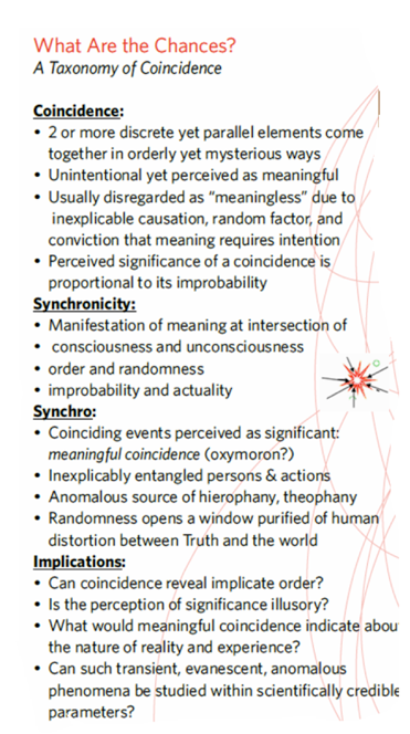 Synchro: the coming together of two or more causally unrelated facts coinciding in a very improbable manner, reflecting an inner and outer aspect in a way that defines explanation by cause and effect (acausal) and which is vividly experienced as meaningful to the observer.